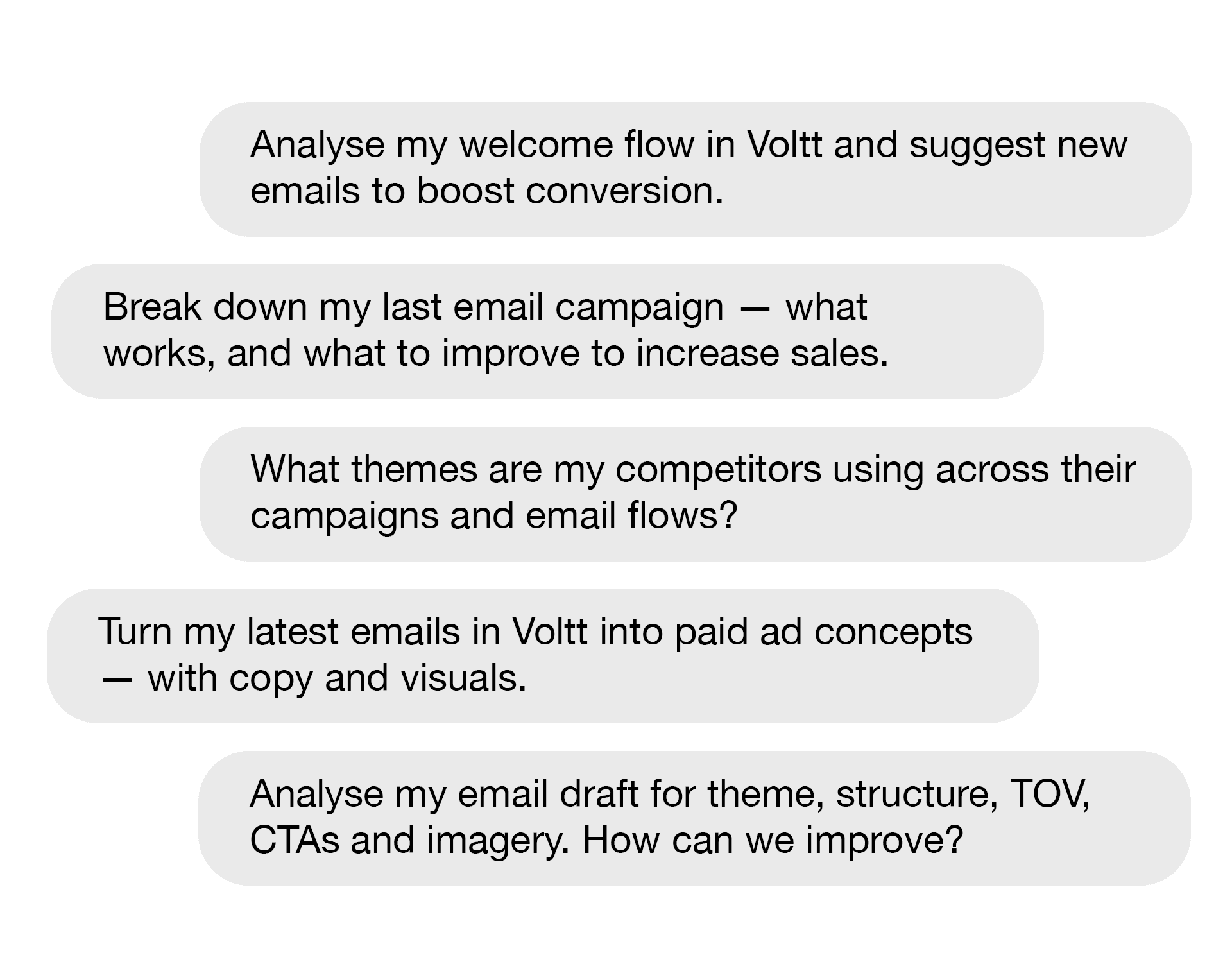 Voltt analyses your email campaigns, your competitors' emails, and the brands that inspire you — to help you create high-performing emails faster.